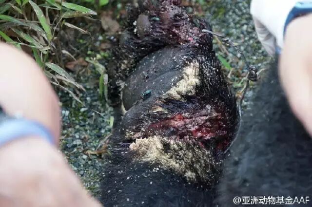 从小熊的情况来看,她困于此处已经好几天时间。她的手掌已经不是正常熊类湿润、有弹性的样子,而是又干又硬,是严重脱水的表现;她的伤口严重溃烂、发炎。图片中的黄色斑点都是苍蝇的虫卵…… 剧痛之下,她一定数次试图咬断手上的铁丝,以至于牙齿都碎掉了好几颗。不仅如此,她的两只手指都被自己生生咬断!