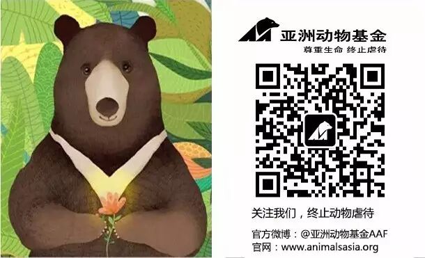 亚洲动物基金(Animals Asia Foundation)是一个以改善动物生存环境为目的的非营利慈善机构。如果你想持续关注小彩虹,请关注他们的救熊团: