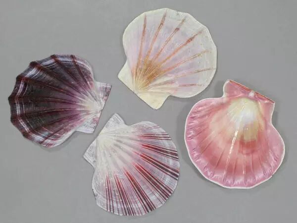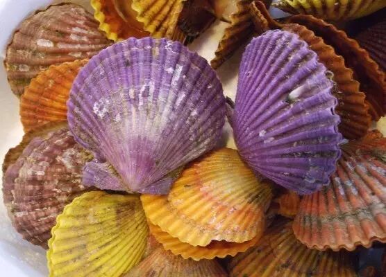 华贵栉孔扇贝的贝壳有橙色、紫色、褐色等多种颜色。海湾扇贝原产大西洋,体型比栉孔扇贝小,贝壳直径一般也就五六厘米。紫扇贝原产南太平洋,在美洲是主要的养殖贝类,壳是紫色的,体型大闭壳肌也大。