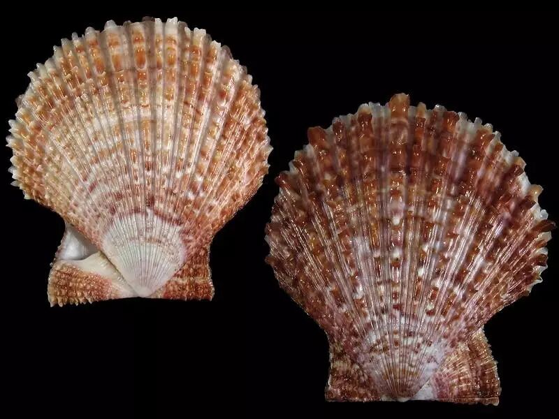 其实,干贝的来源不止一种,包括了扇贝科和江珧科的很多种贝类,不过根据产区和产量推断,我小时候见到的干贝很多都应该来源于栉孔扇贝Chlamys farreri。栉孔扇贝属于双壳纲,顾名思义它有两片壳,贝壳形状就像个折扇,壳表面有标志性的辐射状纹路。扇贝科有一些种类贝壳有各种鲜艳的颜色,在收藏界很受欢迎。
