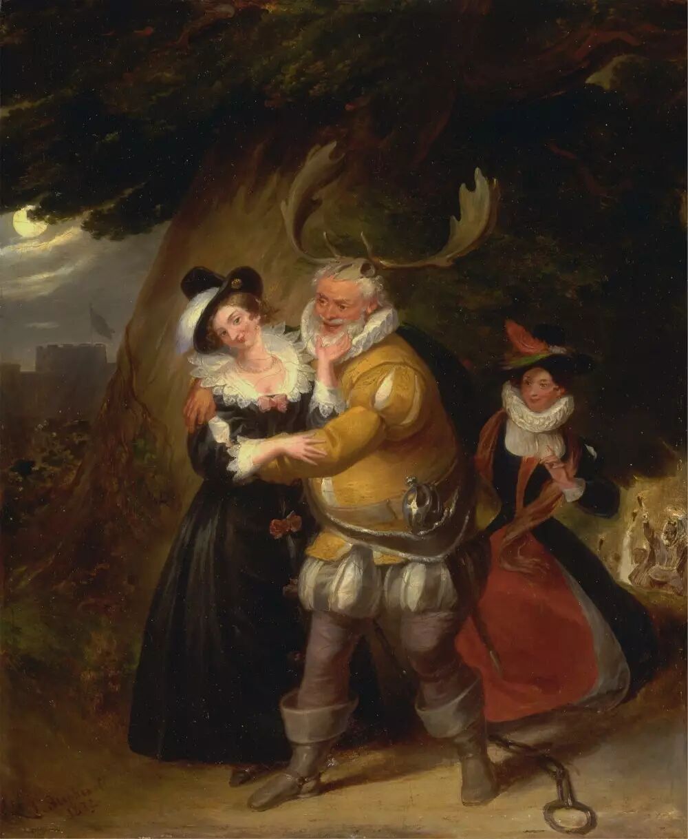 剧中第五幕的第五场,福斯塔夫正假扮成幽灵猎人赫恩,到林苑幽会。James Stephanoff的画作。图片:wikimedia