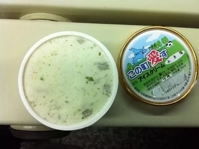 比较猎奇的就是这种“蕗叶冰激凌”,据说只有北海道某些地方才能吃到,颜色淡绿,味道微咸,表面还可见叶子碎片。
