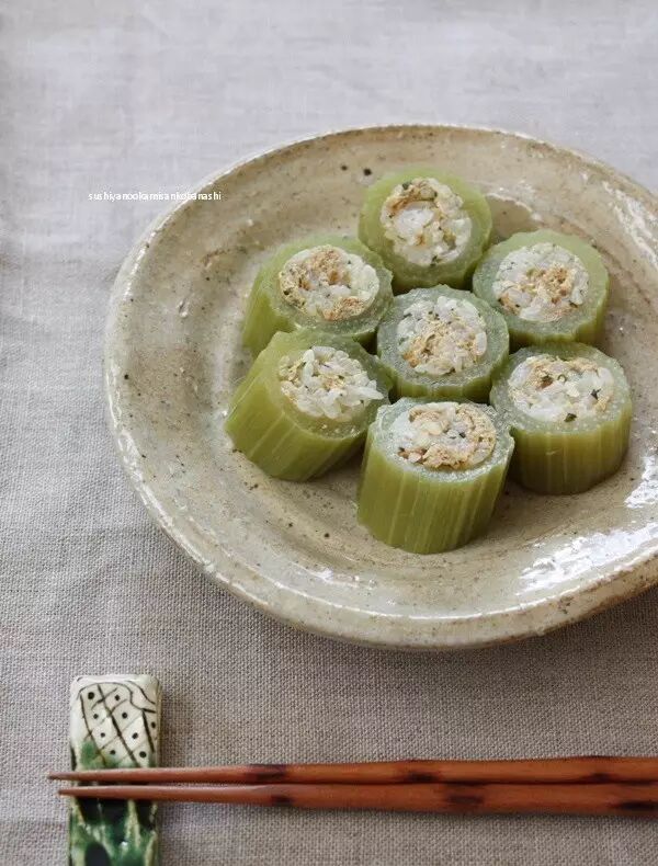 此外,还能利用叶柄中空的特点做点文章,为此日本人发明了“蕗寿司”,用米饭和金枪鱼糜填充到蒸熟的叶柄里面,看起来很像我们天朝的丝瓜酿肉呢~