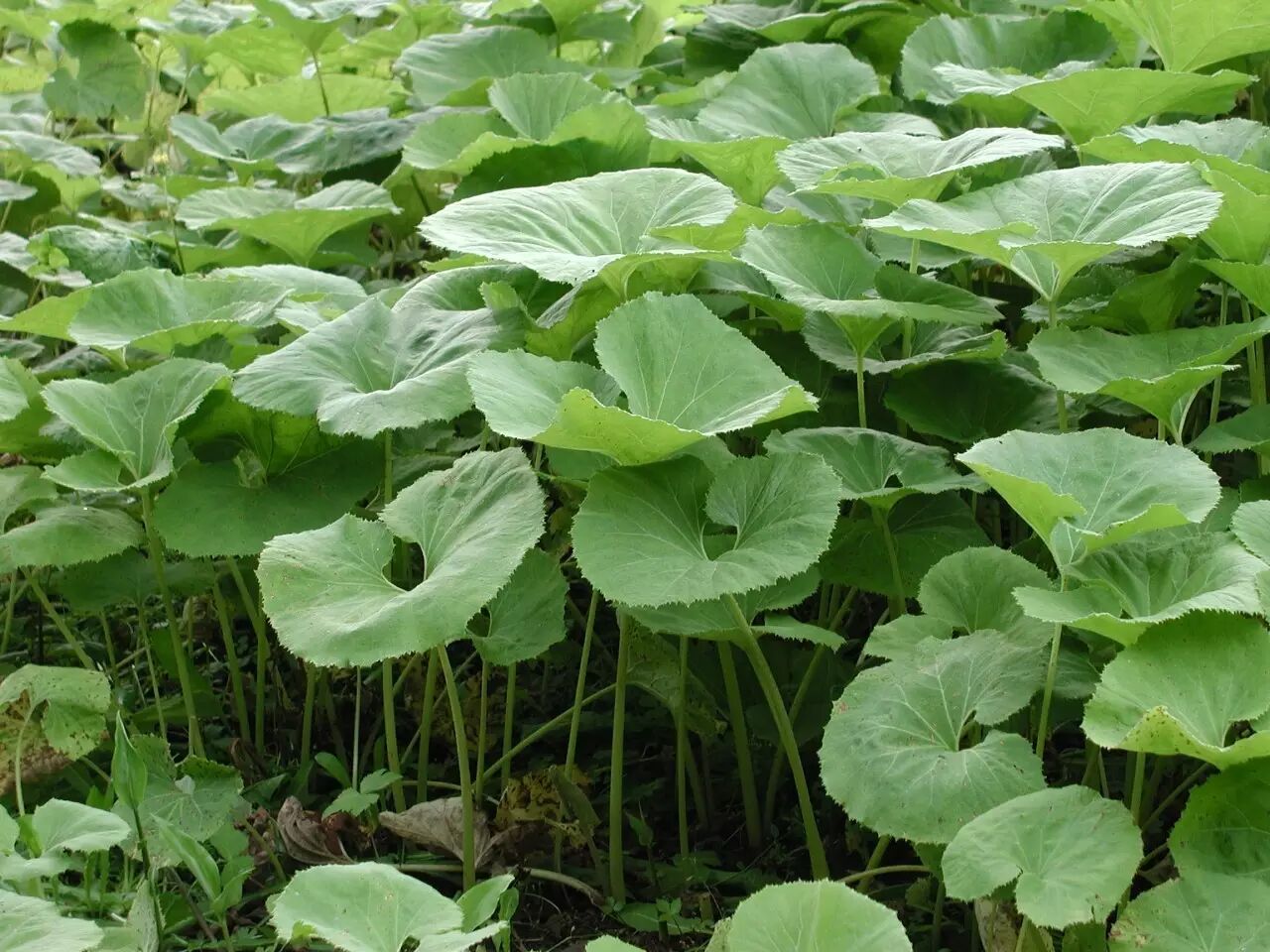 片中长着那么大的叶子的,是蜂斗菜的一个亚种,日文叫“秋田蕗”,学名P. japonicus ssp. giganteus,亚种名"giganteus"为“巨大”之意。北海道足寄町螺湾川流域出产的秋田蕗,尤其高大威猛,经常见报道说它们的“茎”能长到2~3米高——哎,身高倒是没报错,但那并不是茎,而是人家修长的叶柄,那它们的茎在哪里?埋在地下,跟生姜一样的,横向生长。据说还有长到4米高的秋田蕗,相传可以骑马从底下穿过,且不论真假,成片生长的秋田蕗让孩童玩捉迷藏还是绰绰有余的。