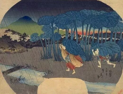 由于叶柄纤维素韧性强,加上叶片宽大,自古以来,秋田蕗就被当成了实用免费的“雨伞”。五云亭秀贞所绘制的团扇《秋田蕗图》,就描绘了一幅“暴雨骤降,路人身披秋田蕗叶片匆匆赶路”的世俗画面。