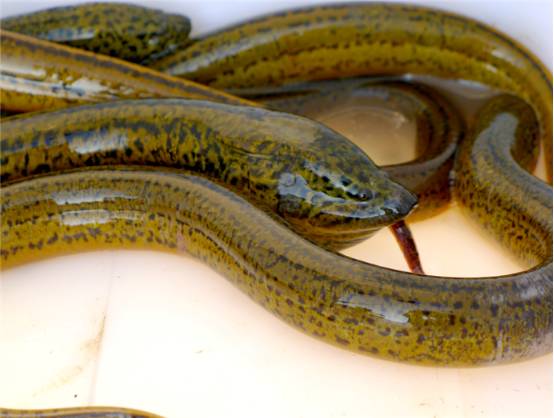 黄鳝给人最深的印象是身体没有鳞,取而代之的是一层滑溜溜的黏液,抓起来很费劲,像本文开头我那样拿手直接去攥肯定是抓不到的,需要用特殊的武林绝招去抓,练到拿三个手指卡住颈部,黄鳝就跑不了了。这种鹰爪功非常难练,非十几二十年苦习不可。