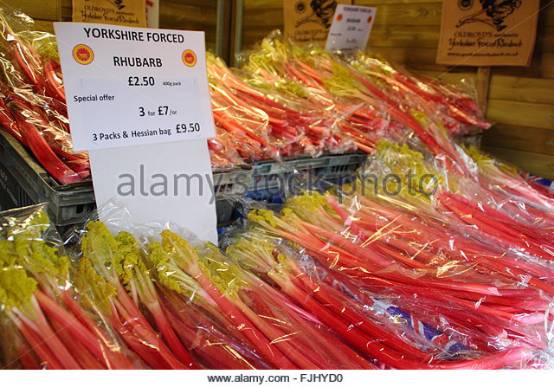 西约克郡的大黄在冬天种植在完全遮光的暖棚里,只用蜡烛照明,这样可使叶柄快速徒长,肥大,而叶片则是又小又黄了。这种方法种植出的大黄,叶柄口感比室外种植的更柔和细腻。
