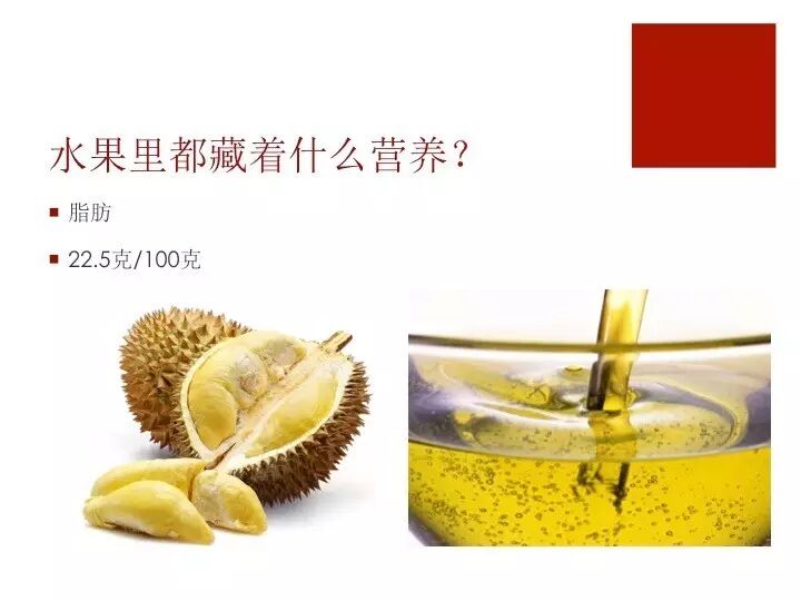 除了糖,水果里还含有很多的:脂肪!不要惊讶,虽然我们并不会吃得满嘴油光,但其实很多水果热量并不低。举个例子,你有没有注意过,吃榴莲很容易有饱腹感。那是因为,每100g榴莲里大概有22.5g的脂肪,已经接近油用玉米的脂肪含量。