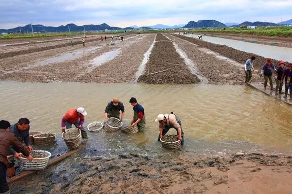 人们正在蛏田中采收蛏子。图片:Flickr.com