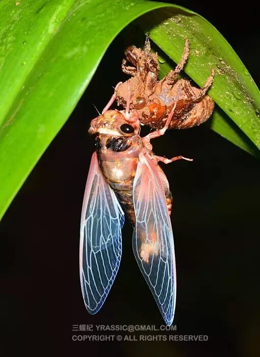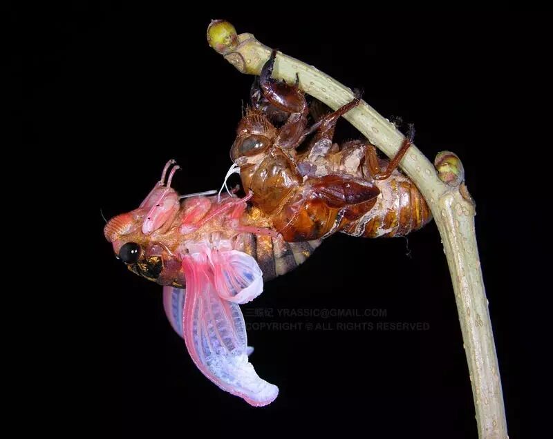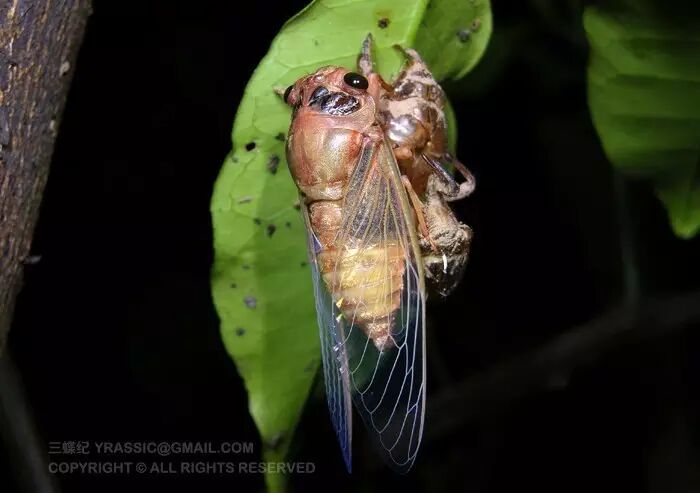 黑蚱蝉刚刚完成羽化,尚未定色,还不黑。图片:三蝶纪