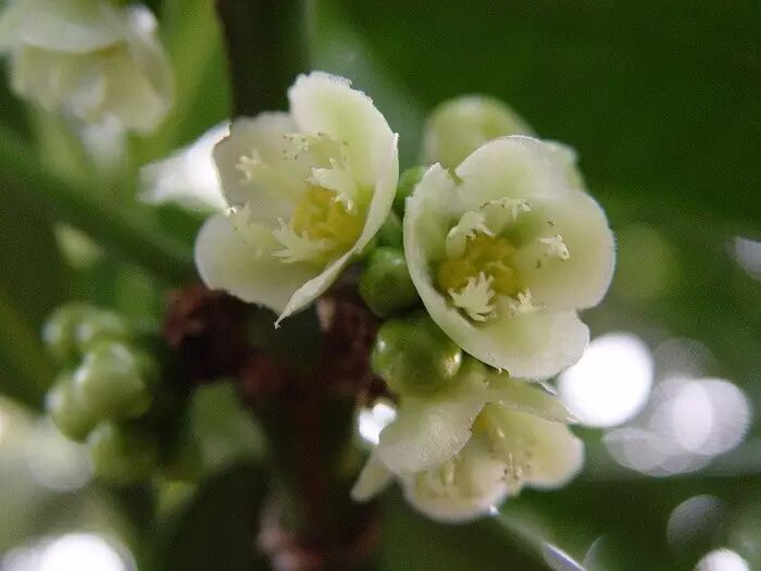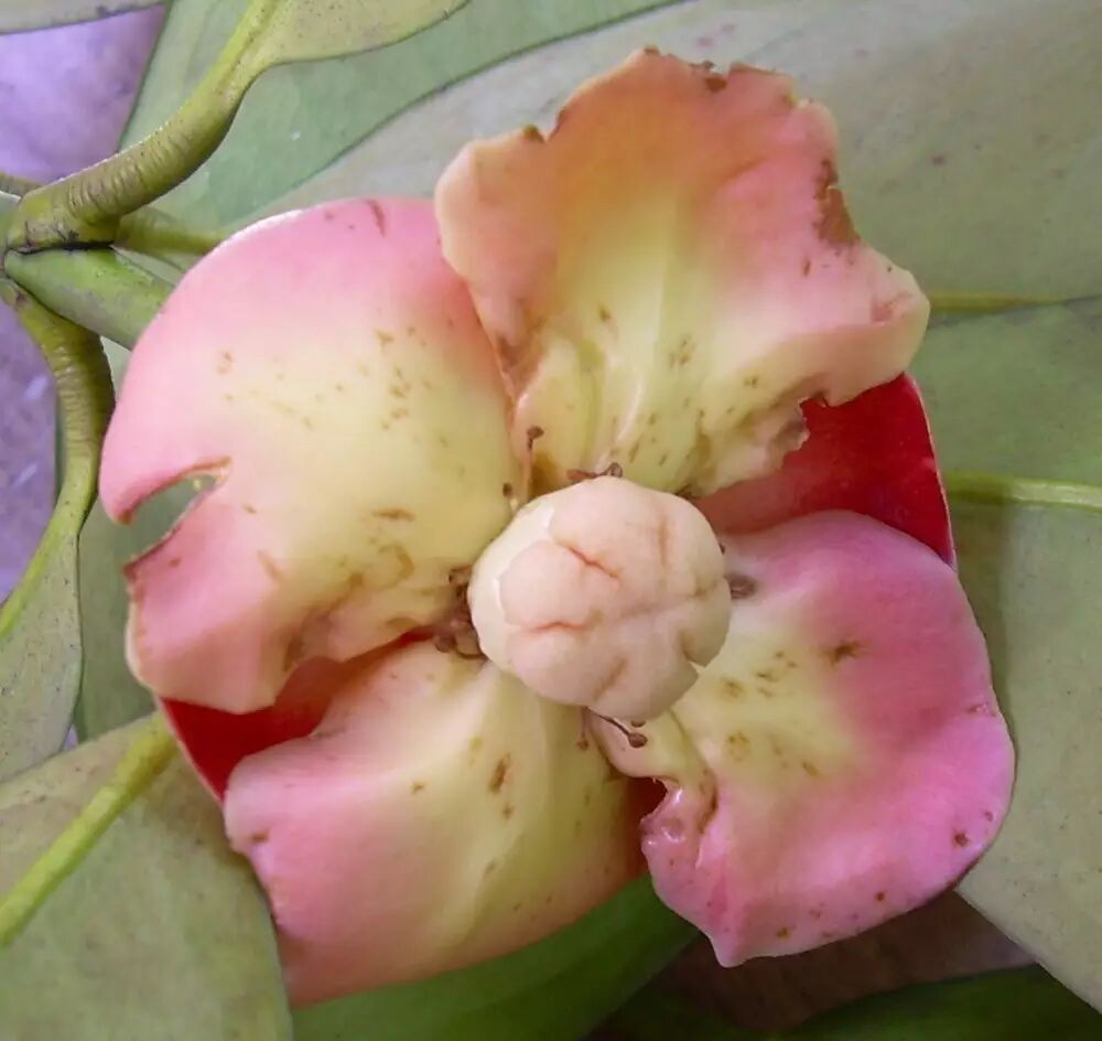 每年9到10月,山竹枝头便开出美丽的白色花朵,花颇大,直径有4-5厘米。山竹的花是单性同株的,雄花数朵簇生,有退化的雌蕊;雌花单生,没有雄蕊,开花后期花瓣逐渐转为粉红色。绝大多数时候,山竹的雄花只是个摆设,雌花不需要授粉就能自己结果。这种生殖方式叫做无融合生殖,是孤雌生殖的一个类型,产生的种子实际上是母本的克隆体。从这个意义上说,山竹是彻头彻尾的母水果,难怪会被封为王后。