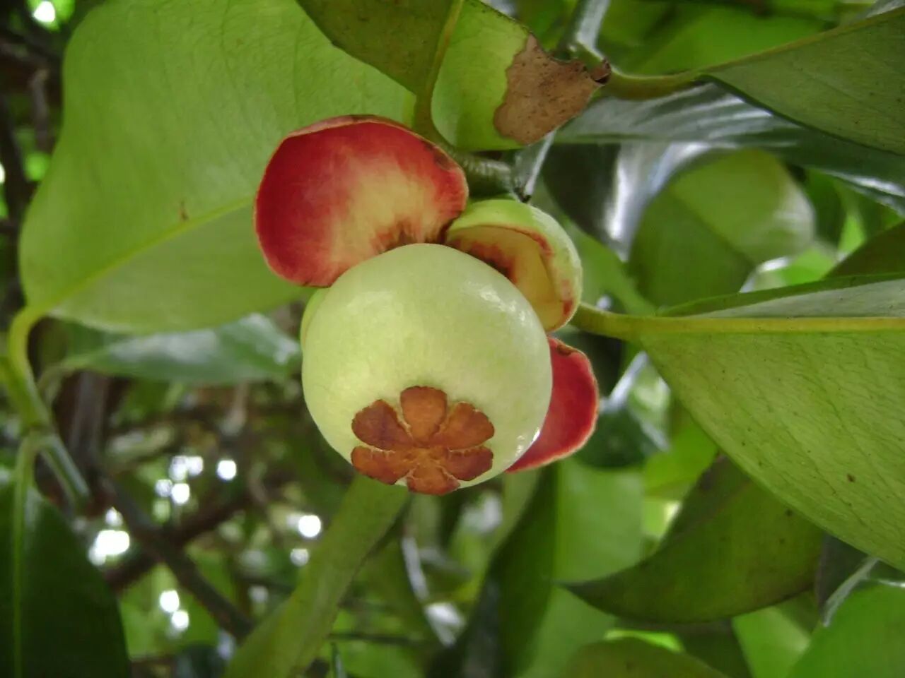 单身的雌花凋谢以后,幼果逐渐长大。起初是绿色,如果幼果被掩盖在浓密的枝叶下见不到阳光,甚至会一直保持白色。经过一个多月的成长,果皮开始出现红色的条纹,最终整个变成紫红色,山竹就成熟了。