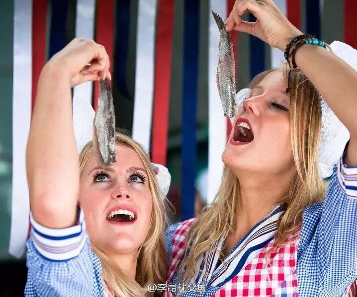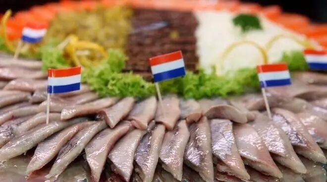 在荷兰,每年六月的第二个星期六,都要举办一年一度的鲱鱼节,此时捕捞上来的鲱鱼体内蓄积了大量脂肪,口感最为肥美。腌鲱鱼(maatjes)是荷兰人的传统美食,用盐轻腌后的鲱鱼淋上柠檬汁配上洋葱丁,一整条直接吞下,鱼肉鲜甜可口。