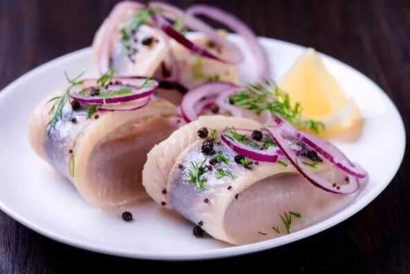 北欧的一些国家,人们还喜欢把鲱鱼用醋、洋葱、茴香等香料腌渍,这就是传统的醋腌鲱鱼(Pickled herring),搭配酸黄瓜或黄芥末一起食用,酸酸甜甜,鲜嫩爽滑,常常被当做庆祝新年的美食。