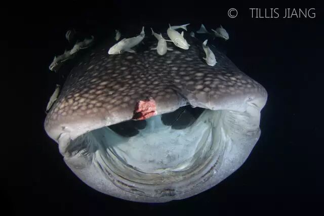 但实际拍摄中,往往会发现,许多鲸鲨脸上都有奇怪的伤疤。有些嘴部正中央有大豁口,像兔唇一样;有些嘴巴上豁了好几处,新伤往往还带着血色;有的脸上挂着鱼钩;有些背部有着可怕的伤痕,那是当年被螺旋桨严重击伤留下的印记;更有甚者,整个背鳍不翼而飞,只留下整齐的伤痕。在这片海域,一条鲸鲨想要长大,需要经历多少坎坷,只看这些伤痕便可见一斑。这时很多人可能会十分困惑,是什么让它们破了相?