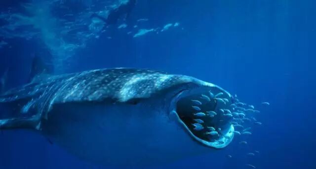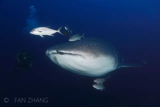极近距离接触,你会发现这里的鲸鲨遮天蔽日的庞大身形下存在着更多秘密:它们其实是许多生物的庇护者,每一条鲸鲨都是一个生态圈。它们前呼后拥,巨人未到,一些领航鱼已经呼啸而至,这条庞然大物的嘴边紧贴着两条搭便车拾牙慧的鮣鱼,面前还跟着好几条巨鲹,虽然其身长都有半米以上,可是比起鲸鲨硕大的脸部,却显得格外玲珑。不过,鲸鲨的眼睛很小,长在庞大的身躯上,显得有些滑稽。
