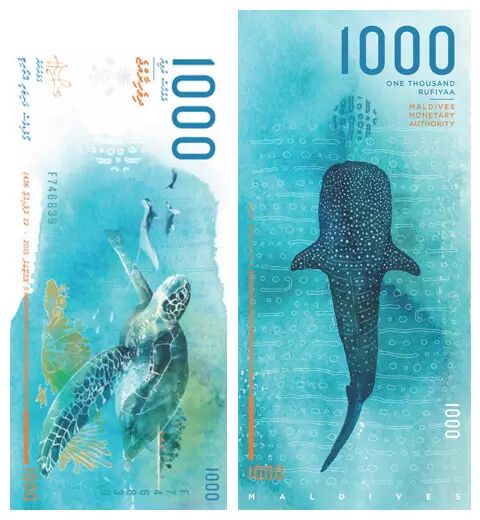 2015年11月,马尔代夫为纪念国家独立五十周年发布了新版钞票,这套号称世界上最美丽的钞票中,1000卢比的钞票,也就是面值最高那张的背面,图案是“来自星星的鱼”——鲸鲨,从这里不难看出鲸鲨在这个海洋国家的重要地位。