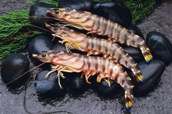 日本对虾就是我们常说的斑节虾、竹节虾,有漂亮的蓝褐色斑纹,与斑节对虾有几分相似,体型比后者纤细,最主要的区别是虾尾有蓝黄相间的花纹,所以又叫花尾虾。日本对虾的弹性和甜度都极好,比斑节对虾口感好很多,甚至适合刺身,在对虾中属上品,因此价格也很高。