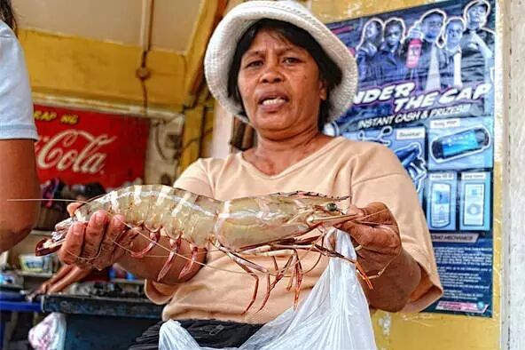 斑节对虾体色通常有墨绿色、深棕色相间条纹,不同于开篇的配图,下图的个体体色偏绿。额剑上缘有7~8齿,下缘2~3齿,但以7/3者为多。直观的感受就是体型很大,虎背熊腰似的所以又叫牛海老,冰鲜个体虾壳常常会发黑,肉多但肉质略老。