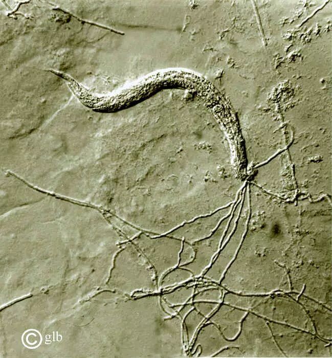 平菇的菌丝强行捅进线虫的口腔。图片:uwlax.edu