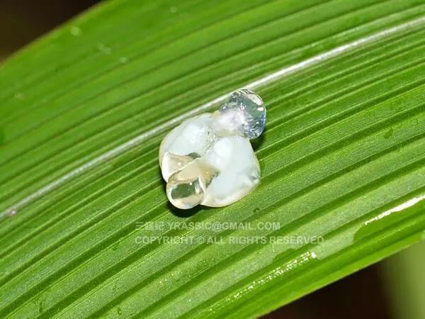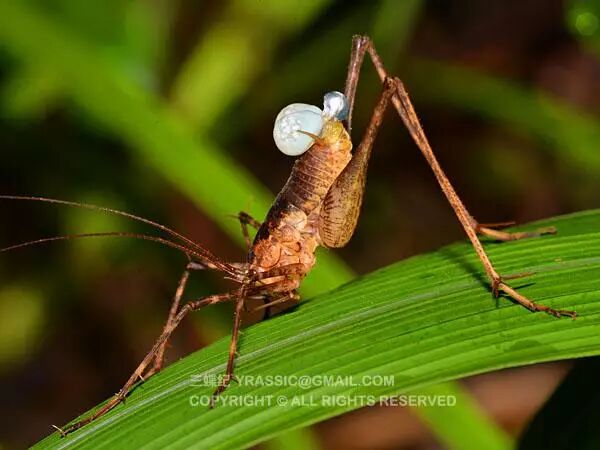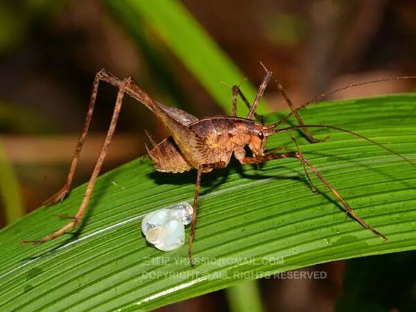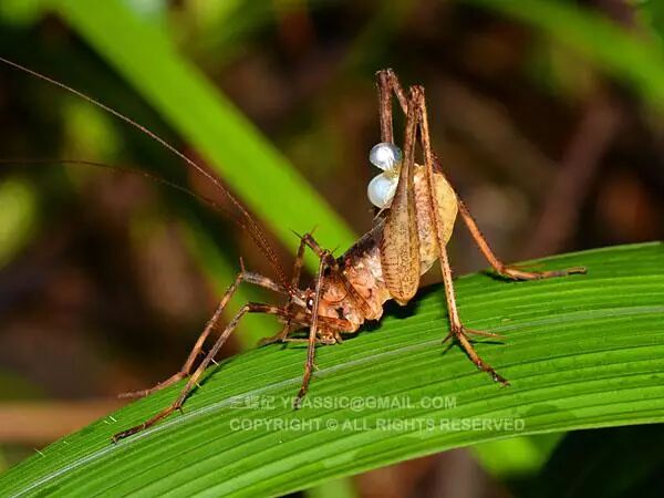 雄性灶马发现雌性不见了 把精包留在草茎上,摄影:三蝶纪