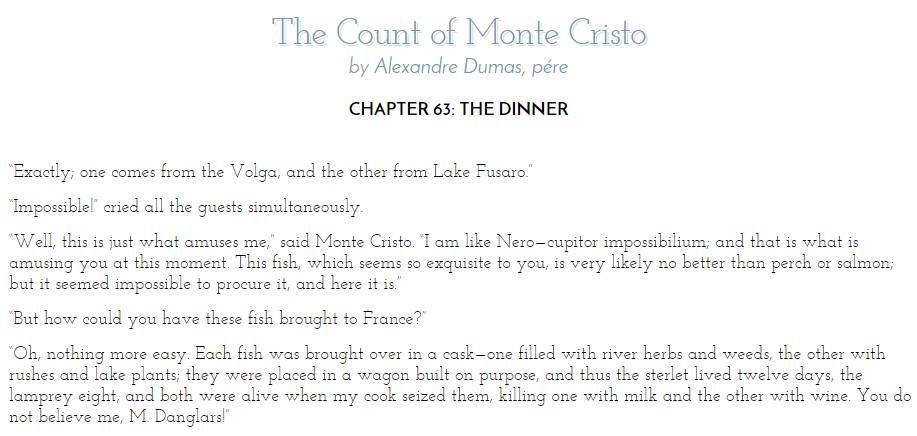 “从伏尔加河钓上来的小体鲟和富扎湖网到的七鳃鳗,分别装在两只大木桶里,一只放满芦竹和水草,另一只放满灯芯草和浮萍,这样它们一路上就死不了……当我的厨师把它们一条用牛奶闷死,一条用红酒醉死的当口,它们还都在活蹦乱跳呢…”