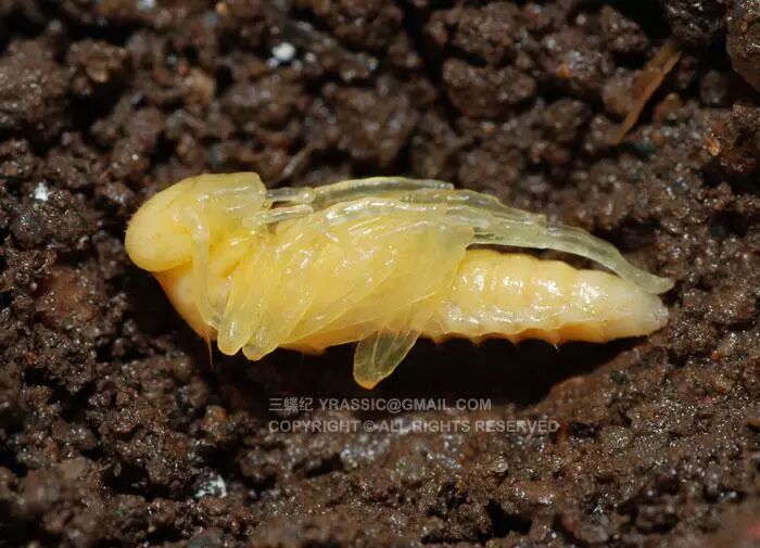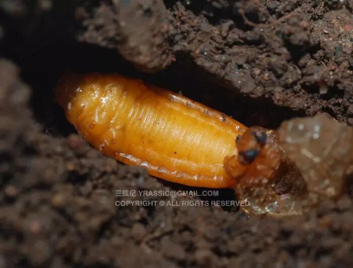从卵中孵化的幼虫即为一龄幼虫,就像一岁的小孩子,每次蜕皮就会增长一龄。芫菁的一龄幼虫是蛃型幼虫,这个时期的幼虫长着发达的足,行动十分灵活。它们在土壤中寻觅最爱的食物——蝗虫的卵。它们的卵形状颜色都与蝗虫的极为类似,只是个头要小一些。找到蝗卵后,一龄幼虫就钻进蝗卵取食。一龄幼虫蜕皮后转为二龄,变成了和金龟类似的蛴螬型幼虫,足部没有一龄时期发达,主要靠腹部的伸缩移动身体。从二龄到四龄,芫菁都维持了蛴螬型幼虫的形态。四龄幼虫要蜕皮时,突然出现了变化。它没有继续取食蝗卵,而是爬出去,在土壤里造了一个蛹室,躲在里面不动,蜕皮变为五龄幼虫。外观看五龄幼虫很像一个蛹,足部短小,身体呈C字型弯曲,但它竟然还没到真正的蛹期,所以这个时期被称为“假蛹”。假蛹呈深黄色,体壁坚硬,这个结构让它们顺利在土壤中越过秋冬两季。到来年春天,假蛹终于蜕皮化成真正的蛹了。芫菁的蛹是裸蛹,晶莹剔透,身体的各个结构已经相当明显了。长长的足和触角并在胸前,颜色质感都似糖浆浇筑的。
