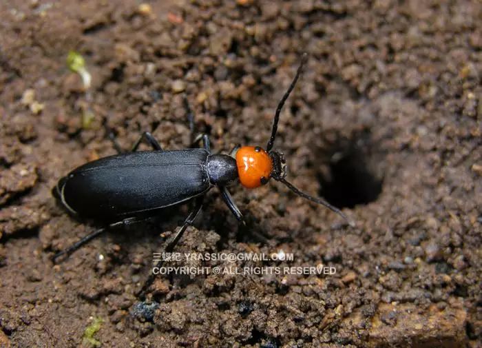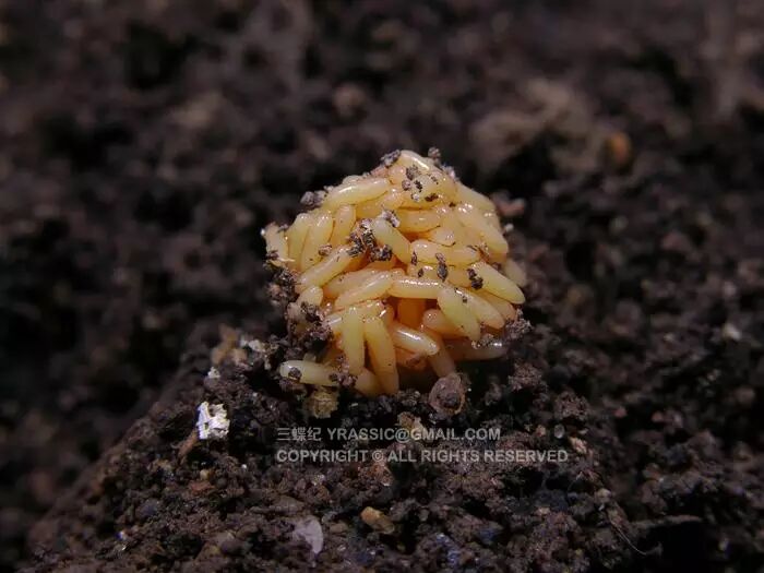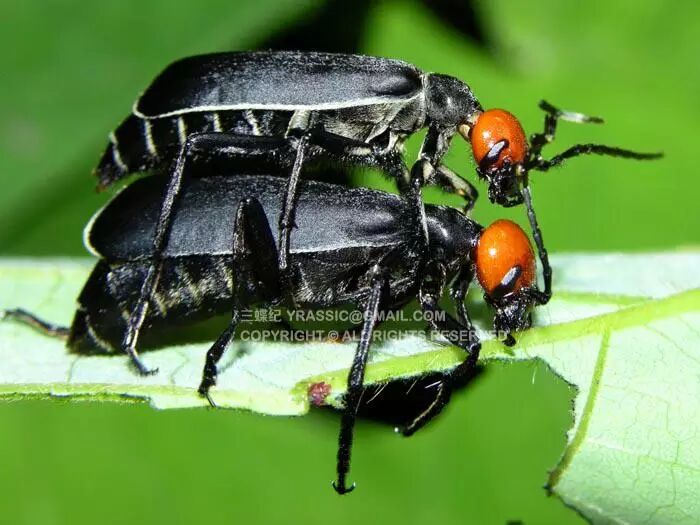 豆芫菁多以豆科植物为食,长着鲜红圆亮的头部,俗名“红头和尚”,黑色鞘翅又被人形象的称为“黑色僧袍”。这红色的头部似乎就在警告天敌——我有毒,别吃我。雌雄芫菁交配完约一天后,雌性芫菁就要在地面上找地方产卵了,它们的卵看起来很像一团粽子米,卵和糯米一样长圆形,酱油一样的颜色,长度只有2-3毫米。