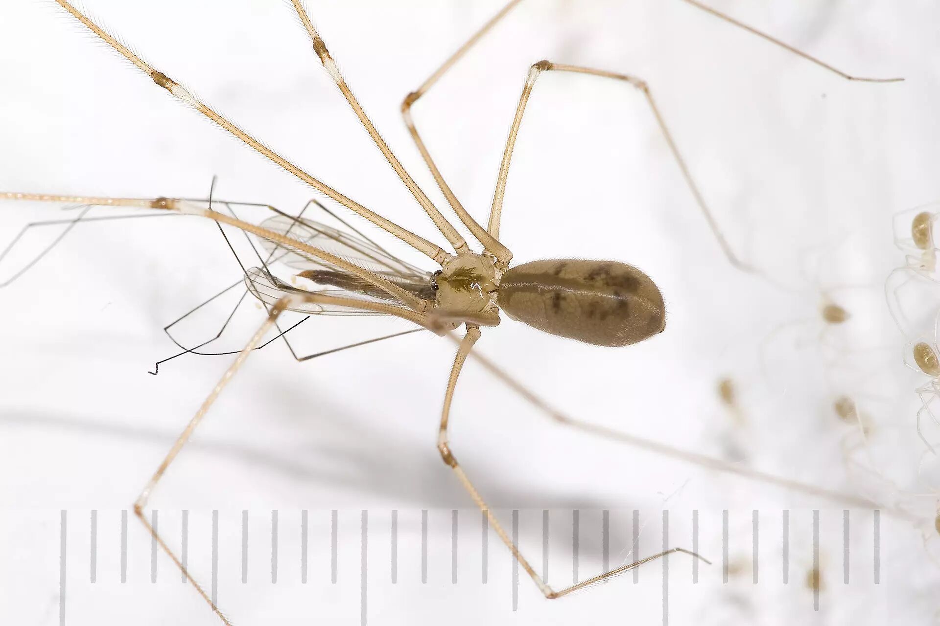 其实不论是周二的白额高脚蛛还是周三的棒络新妇都有长长的细腿,但是和今天的主角——家幽灵蛛(Pholcus phalangioides)比起来,它们那是小巫见大巫。家幽灵蛛雌性个体的体长一般是在9毫米左右,可是算上她们的腿,就足足有7厘米宽了。雄性家幽灵蛛比雌性稍微小一点儿,还不算是特别没有“蛛权”。