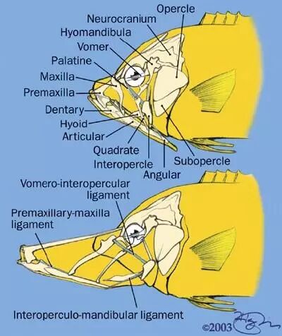 花絮:鱼类的头骨相当复杂,颌骨也有许多变型来适应不同的取食类型。例如海鳗在喉部还具有一副内颚,能够将猎物“拉入”鳗口。