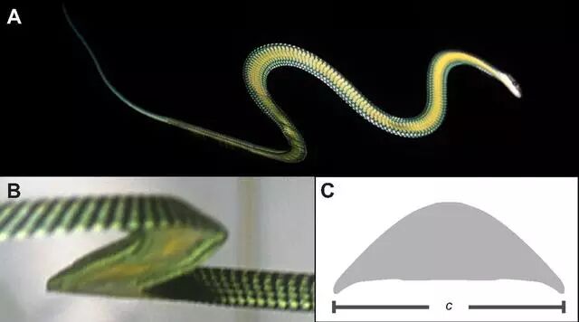 原理:你没看错,蛇也会“飞”,不过准确来说,应该是“滑翔”才对。生活于东南亚地区的金花蛇(Chrysopelea sp.)在长期的丛林生活中演化出了在树木间滑翔的能力。它能依靠肌肉将肋骨向两侧张开,从而使得原本圆筒状的身体截面变扁,从而增加空降时的阻力,并改善气动外形,这使它们在下降的过程中能滑翔上百米远。