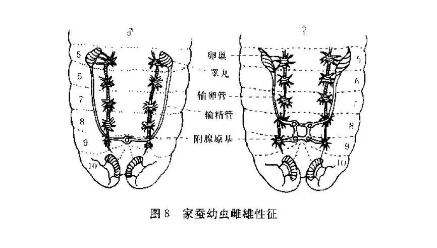 幼虫可从外表分辨雌雄,方法是看身体第9节的腹面,通过体壁可看到附腺原基的的形状,雄性可见一个圆点,雌性则有四个。