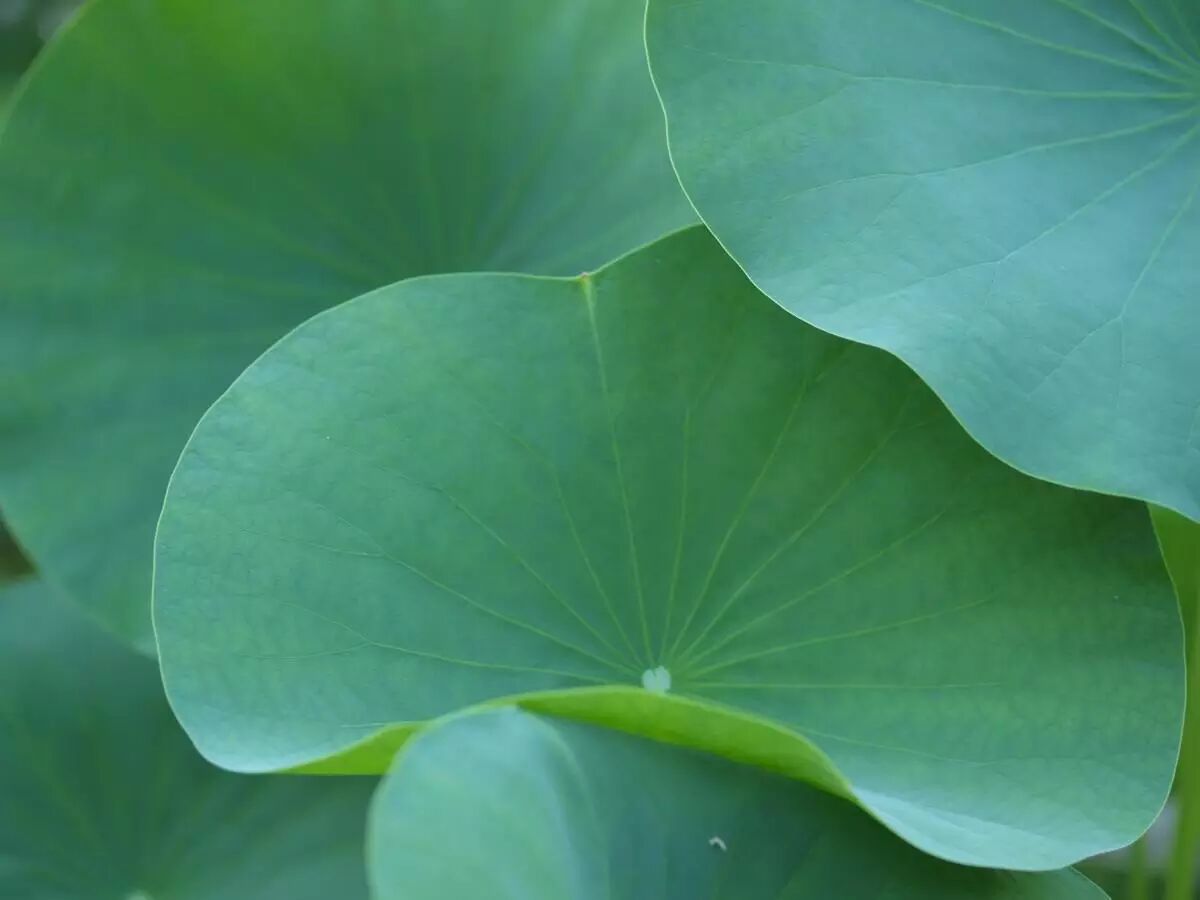藕作为莲的根状茎,整个潜伏在水下的淤泥里;而莲的叶片则以粗壮而多刺的叶柄撑出水面。和藕一样,叶柄中也有很多孔道,通气之余还增加了强度。叶片长在叶柄上的方式叫盾状着生,即叶柄长在叶片背部中间,这是区分莲和其他类似水生植物的一个重要性状。荷叶质地颇粗不堪食,但干燥之后可以用来包裹食物,也算是跟吃沾边。小时候家里煮了粥,会把嫩荷叶切丝撒在粥面上,取其清香,吃的时候是要挑出去的。有道菜叫荷叶粉蒸肉,是用荷叶包裹肉或衬垫在肉下面,我认为非常没有道理:久蒸之后荷叶色香俱失,又不能吃,那跟用硫酸纸有什么区别?