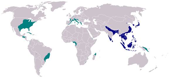 白纹伊蚊的分布区,蓝色为原始分布区,绿色为入侵区域。图片来自wiki