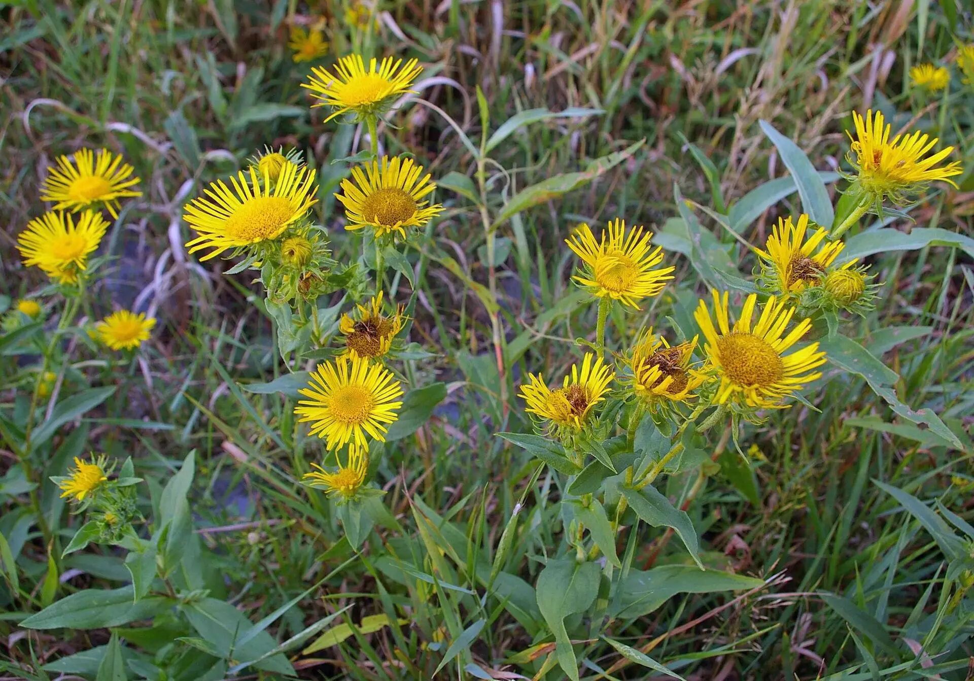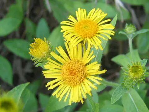 旋覆花是多年生草本;广披针形或长椭圆形的叶子互生,头状花序,生于枝顶,夏秋开金黄色花。舌状花 1 层,黄色,管状花多数。