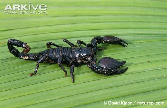 非洲帝王蝎体型巨大、螯足粗壮有力,然而生性平和毒性微弱。图片来自arkive.org