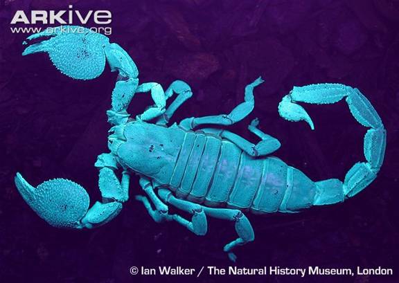 蝎子在紫外光下会发出蓝色荧光。图片来自arkive.org