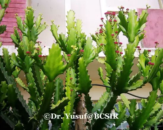 不过也不要误会,这个长相并不是大戟属的标准长相,事实上大戟属的标准长相没人说得清楚,因为这个属最大的特点就是种类繁多、生境差异大、各类变异层出不穷,7月3日的泽漆中就已经有了一大堆的例子,而其中有一类大戟的长相还似乎和仙人掌有些暧昧不清,比如大戟属的模式种火殃勒 E. antiquorum 长这样: