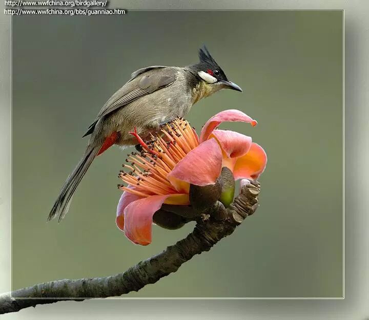 访问木棉花的红耳鹎,图来自中国鸟类图库。
