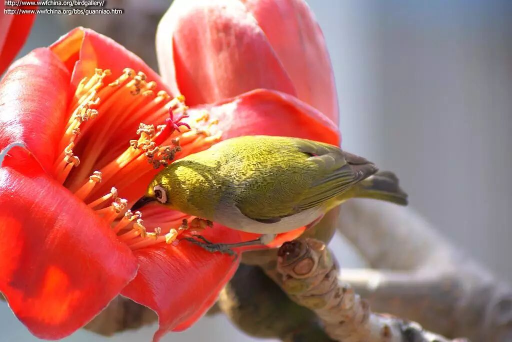 访问木棉花的暗绿绣眼鸟,图来自中国鸟类图库。