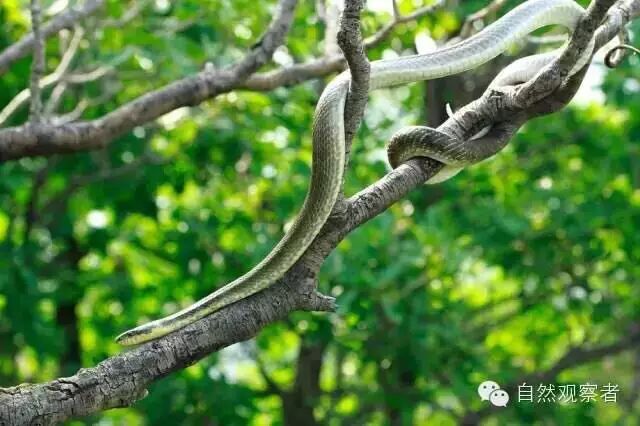 女孩子突然“啊”的叫了一声!原来是一条赤峰锦蛇懒洋洋地趴在树枝上晒太阳呢。