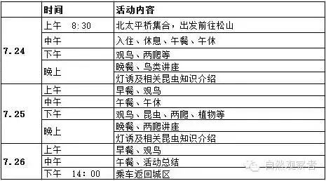 现在!自然观察者暑期亲子博物夏令营第一季开始招生了。我们将在7月24日(五)~7月26日(日)前往北京松山,去感受那里的自然之美:听虫鸣蛙叫,闻鸟语花香。本次旅行以博物为主线,夜间还特别设有灯诱环节。三位指导老师还在活动中为您带来鸟类、昆虫以及两爬等动植物知识的高端讲座!还等什么?快快联系我们吧,让我们一起去体验自然之美吧!