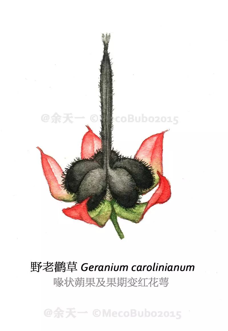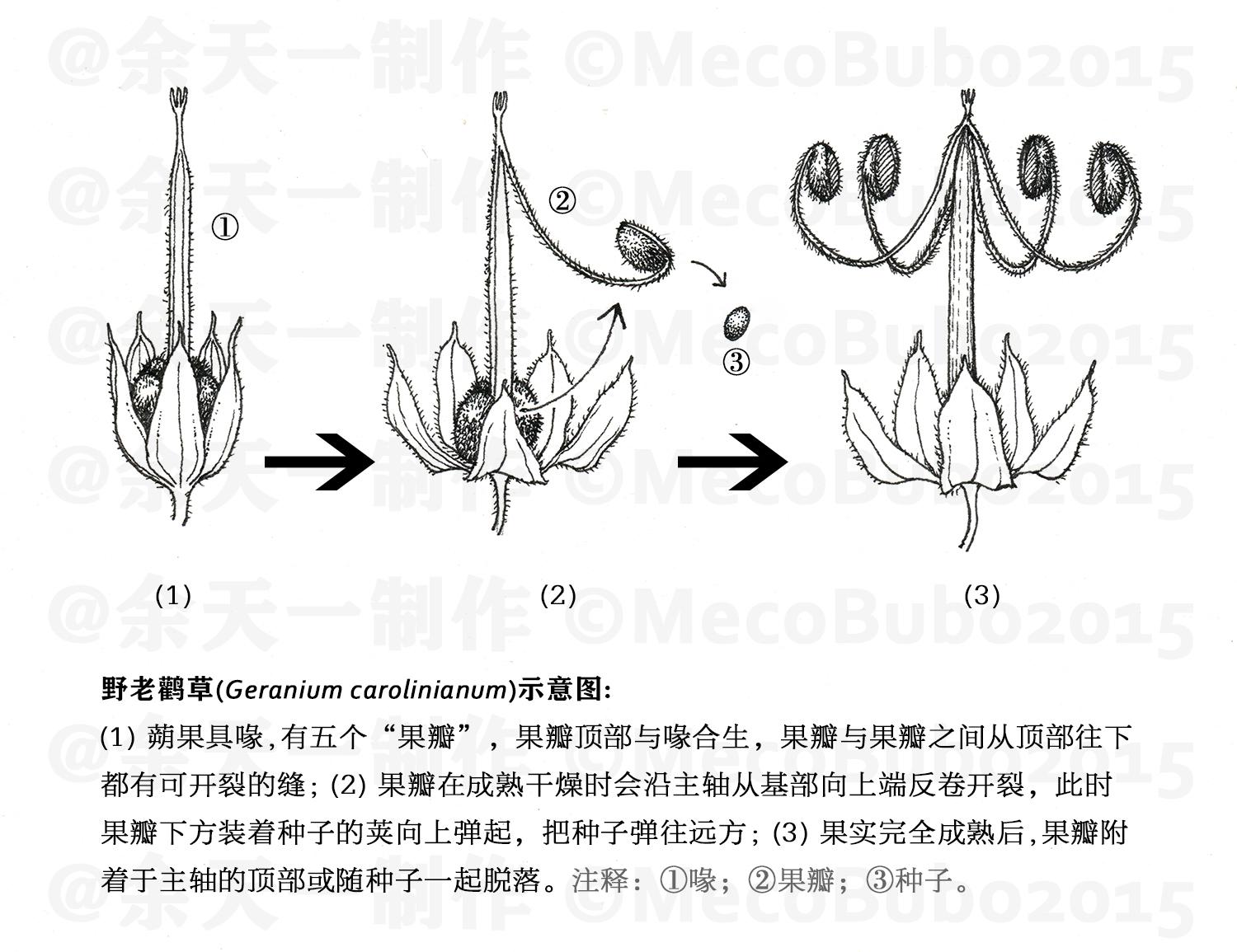 老鹳草属的果实最为特别,这也是为何它们被称为“老鹳草”——蒴果具有长长的“喙”,看起来就像是鹳鸟的长嘴。老鹳草的果实不仅形态特殊,传播种子的方式也十分特别:蒴果有五个“果瓣”,果瓣只有顶部是与喙合生的,从顶部往下都有可开裂的缝。果瓣底部有装着一粒种子的碗状种荚,种荚在成熟时会在底部打开。未成熟时紧贴着喙的果瓣在成熟干燥时会沿主轴从基部向上端反卷开裂,此时果瓣下方装着种子的荚向上弹起,把种子弹往远方(写完了自己再看一遍发现理解不能,所以这段话请配合下面的示意图观看)。