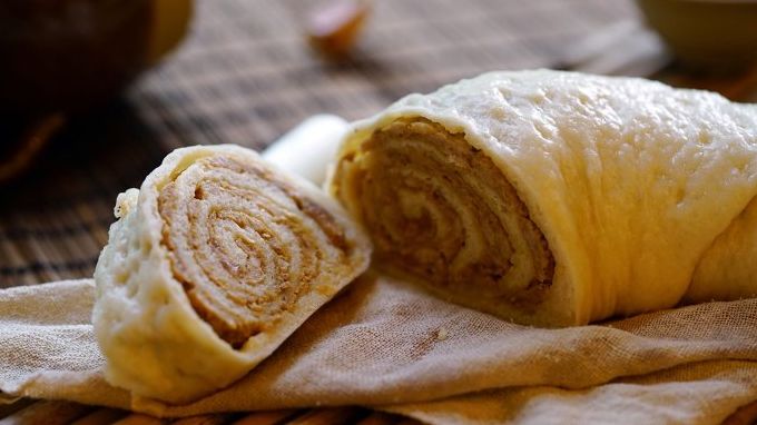 也叫金裹银卷子,其实就是北方人常吃的花卷。玉米面用半开水和好,白面用凉水和好,白面揉成面团,擀成薄圆饼,再把和好的玉米面团叠在白面饼上,擀匀摊平,涂些食用油,撒盐或者花椒盐,卷成一卷,再用刀切成小段,上锅蒸熟即可食用。