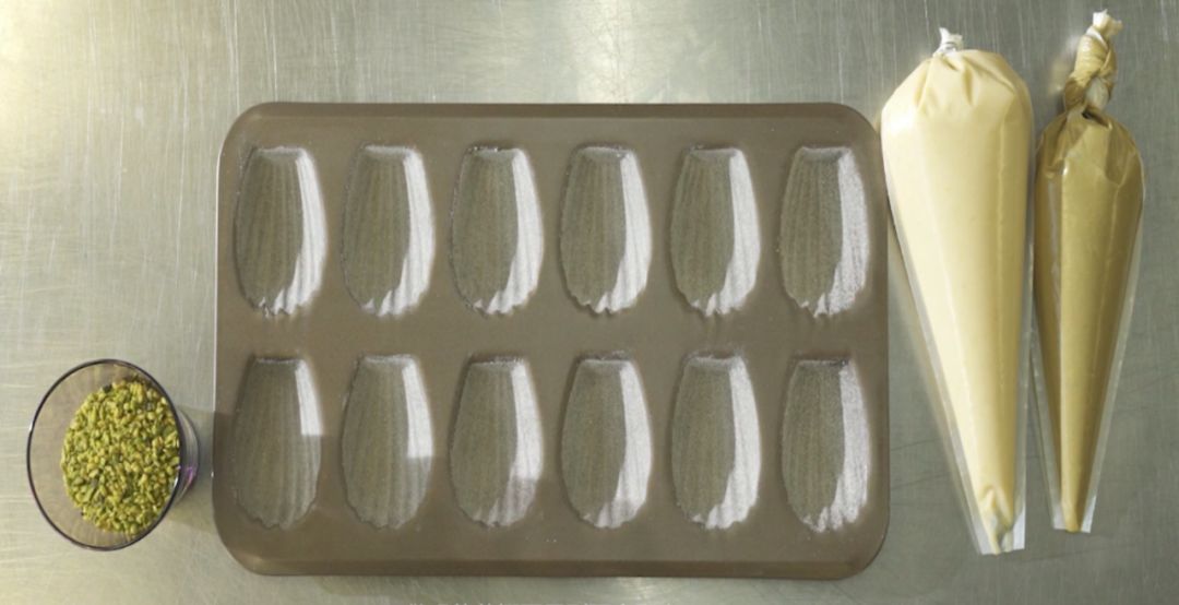 4. 将面糊装进裱花带,挤入预先涂油、撒粉、冷冻过的模具中(八分满即可),入预热过的烤箱上下火180℃烤制15分钟左右,烤好后立刻脱模冷却。