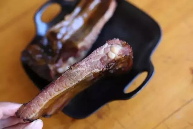熏制的腊排骨肌红脂黄,色泽发亮,吃起来肉特别紧密,很有嚼劲,而且越嚼越香,肉香混合着柴火的香味,一起往人的五脏六腑里面钻,让人欲罢不能,吃了一块还想再吃一块。