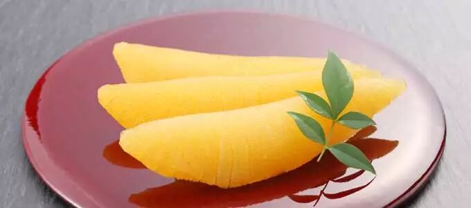 栗子泥(搗ち栗)是明治维新以后才加入年菜豪华菜单的,金黄的颜色象征财富, “搗ち”和“胜利(勝ち)”同音。