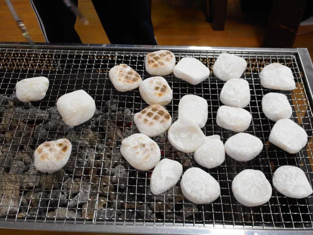 烤年糕也很有意思,烤写作“焼き”,烤年糕就是“焼き餅”,看着像是中文的“烧饼”,其实不是。因为年糕是捣出来的,里面混入了不少空气,在炭炉上一烤,气体膨胀了,就会变得胖胖的,还会鼓出来气泡,筷子一夹能拉老长,挺好玩的。由于年糕外层被烤成了焦香的硬壳,所以会更好吃。