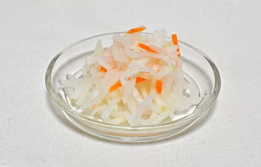 第三层是醋拌凉菜。比如红白脍,其实就是胡萝卜丝拌白萝卜丝,颜色红白取个吉祥,紫苏醋腌宝塔菜寓意长寿,藕片是因为窟窿眼多,看着通透,寓意前途通畅。