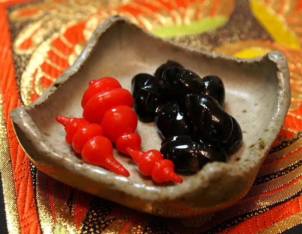 不管分几层,最上面一般是祝肴(祝い肴)和前菜,也有分开的。祝肴菜式有三道,各地有所不同。关东地区一般是黑豆、鲱鱼子、田作。黑豆就是甜味的煮黑豆,寓意健康和勤劳。